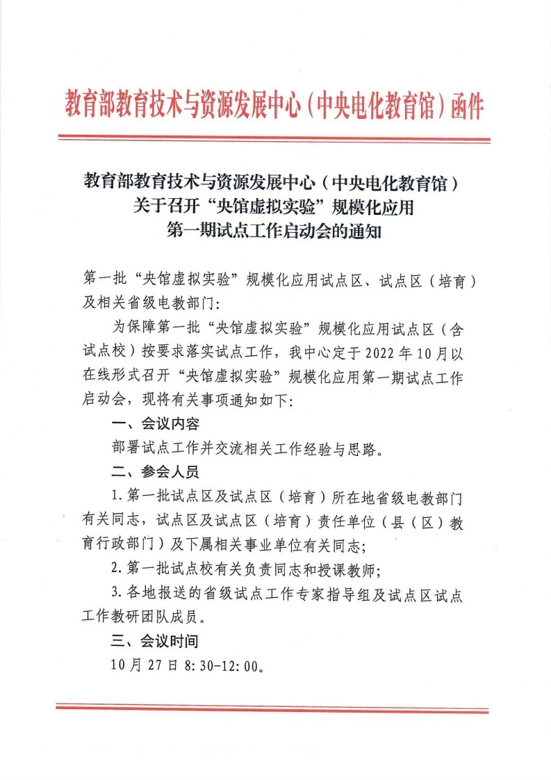 关于召开“央馆虚拟实验”规模化应用第一期试点工作启动会的通知