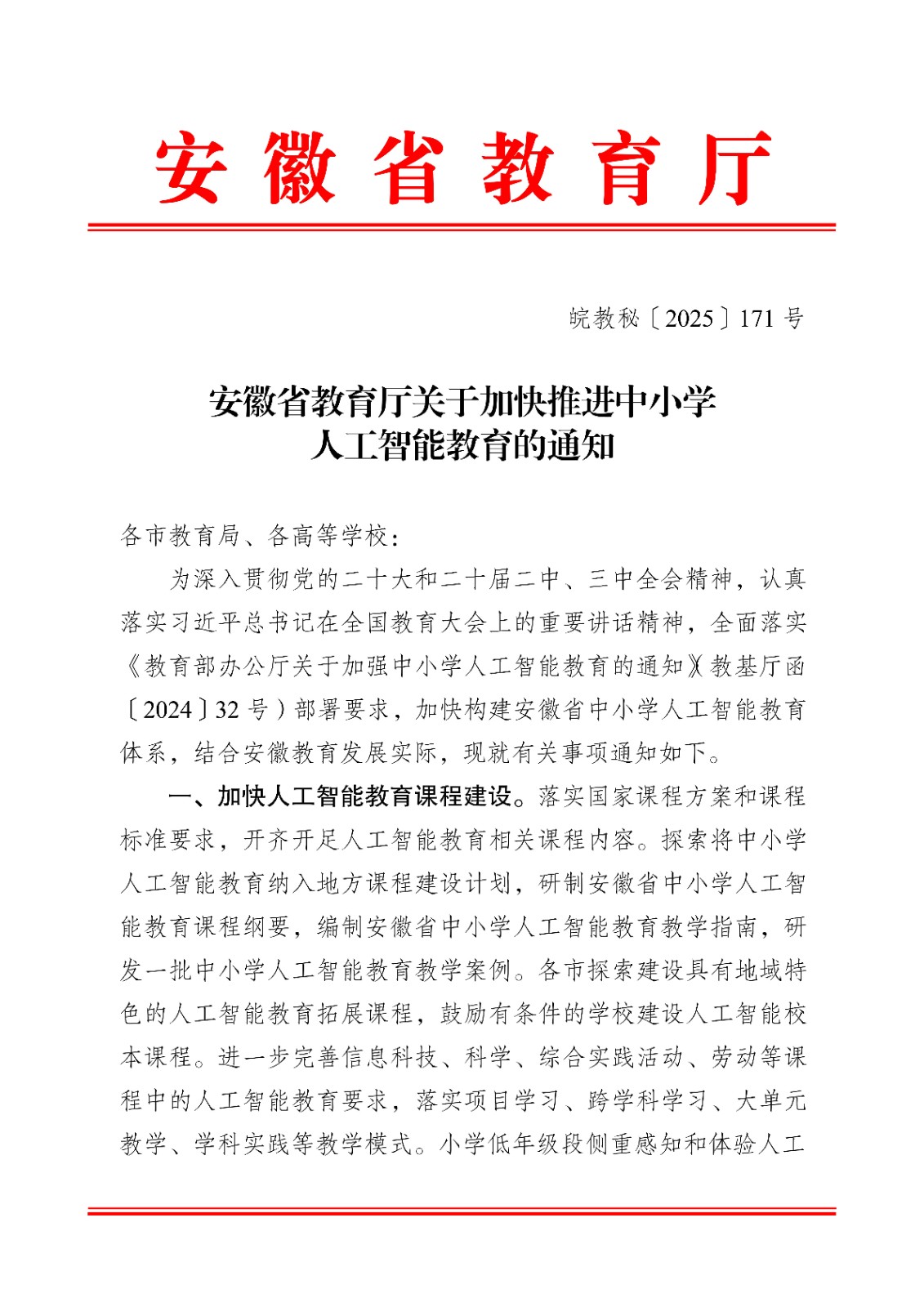 安徽省教育厅关于加快推进中小学 人工智能教育的通知